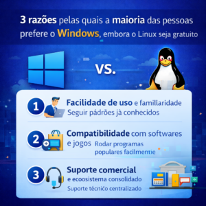 Em outras palavras, o Linux pode ser mais poderoso e econômico, mas o Windows ainda é percebido como mais simples, universal e prático para o usuário médio.